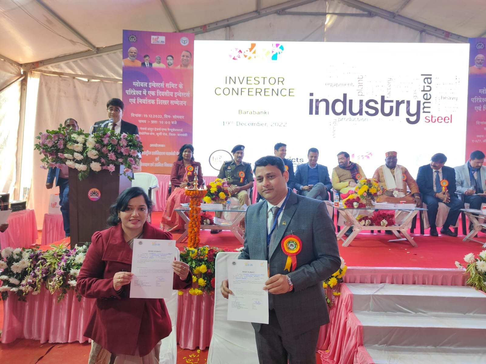 इस अवसर पर मुख्य अतिथि सतीश चन्द्र शर्मा मंत्री खाद्य एवं रसद विभाग ने जिला प्रशासन बाराबंकी के साथ एमओयू हस्ताक्षरित करने वाले सभी उद्यमियों/निवेशकों को हार्दिक शुभकामनाएं एवं बधाई दी तथा आश्वस्त किया कि प्रदेश सरकार की तरफ से उनकी सभी आवश्यकताएं प्राथमिकता के आधार पर पूर्ण की जायेगी, उन्होंने कहा कि प्रदेश सरकार व्यापार अनुकूल वातावरण तथा रोजगार के नये अवसर सृजित करने हेतु कटिबद्ध है, तथा इस हेतु निरन्तर जिला प्रशासन उद्यमियों/निवेशकों के साथ समन्वय स्थापित करने हेतु लक्ष्य प्राप्ति हेतु कार्य कर रहे हैं। उन्होनें कहा कि प्रधानमंत्री के संकल्प ‘‘रिफार्म परफाॅर्म एण्ड ट्राॅसफार्म‘‘ की सिद्धि हेतु मा0 मुख्यमंत्री श्री योगी आदित्यनाथ जी के नेतृत्व में हम सभी आगे बढ़ रहे हैं, उन्होनें कहा कि वैश्विक निवेश आमंत्रित करने हेतु प्रदेश के मा0 मंत्री गण व अधिकारी गण 20 प्रमुख देशों की यात्रा पर गये हैं, जहां से 10 से 12 फरवरी-2023 के मध्य लखनऊ में प्रस्तावित ‘‘ग्लोबल इन्वेस्टर्स समिट‘‘ हेतु व्यापक निवेश-प्रस्ताव मिलने की उम्मीद है। उन्होनें कहा कि प्रदेश 1057 किमी0 की एक्सप्रेसवे, 24 घंटे निर्बाद्ध विद्युत आपूर्ति, 03 अन्तर्राष्ट्रीय हवाई अड्डे, 09 हवाई अड्डे, 1000 मील रेलवे नेटवर्क, 20,000 एकड़ उपलब्ध लैंड बैंक, 75 विश्वविद्यालय, 4000 काॅलेज के साथ विकास के त्वरित पथ पर अग्रसर है। उन्होनें कहा कि ग्लोबल इन्वेस्टर्स समिट हमारे विकास की इस गति को नये आयाम प्रदान करेगी।