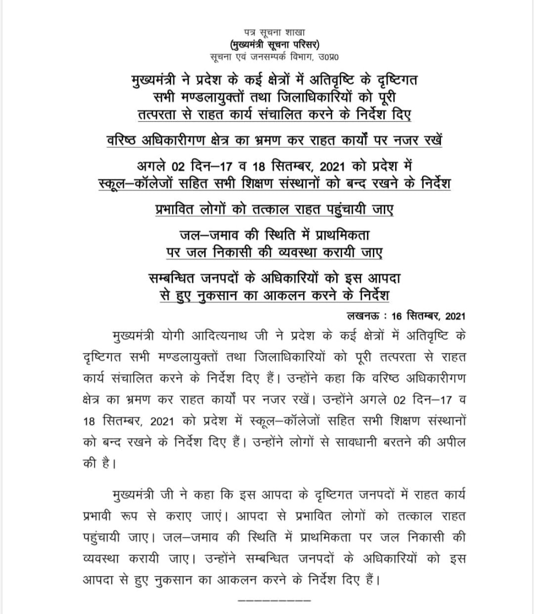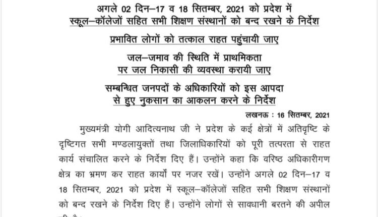 लखनऊ : यूपी में लगातार दो दिनों से हो रही बारिश ने जनजीवन अस्तव्यस्त कर दिया है। पिछले 24 घंटे में 45 लोगों की मौत हो गई है। कई स्थानों पर पेड़-पोल और मकान धराशायी हो गए हैं। इसे देखते हुए यूपी सरकार ने शुक्रवार को प्रदेश के सभी स्कूल कॉलेजों को बंद रखने का निर्देश दिया है। मुख्यमंत्री योगी आदित्यनाथ कार्यालय की ओर से इस बाबत सूचना जारी की गई है।