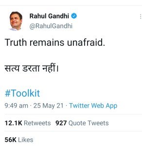 नयी दिल्ली : कांग्रेस के पूर्व अध्यक्ष राहुल गांधी ने कथित ‘कोविड टूलकिट मामले में दिल्ली पुलिस की ओर से माइक्रो-ब्लॉगिंग वेबसाइट ट्विटर के कार्यालयों पर छापा मारे जाने के एक दिन बाद कहा कि सत्य डरता नहीं है उन्होंने ‘हैशटैग टूलकिट के साथ ट्वीट किया, ”सत्य डरता नहीं। गौरतलब है कि दिल्ली पुलिस के विशेष प्रकोष्ठ की टीम ने कथित ‘कोविड टूलकिट मामले की जांच के संबंध में ट्विटर इंडिया के दिल्ली और गुरुग्राम स्थित कार्यालयों पर सोमवार की शाम छापा मारा