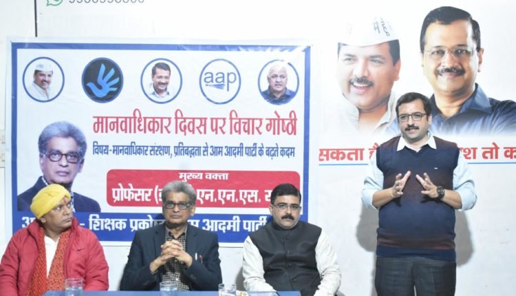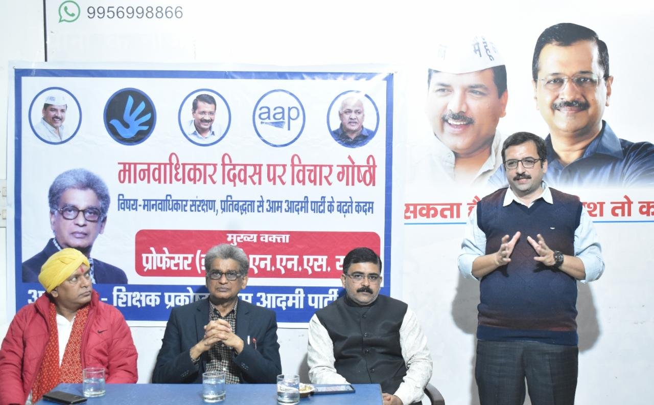 नई दिल्ली। आम आदमी पार्टी शिक्षक प्रकोष्ठ द्वारा प्रदेश कार्यालय पर अंतराष्ट्रीय मानवाधिकार दिवस के अवसर पर मानवाधिकार संरक्षण  प्रतिबद्धता से आम आदमी पार्टी के बढ़ते कदम विषय पर विचार गोष्ठी का आयोजन किया गया। जिसमें मुख्य वक्ता के रूप में विधि के विख्यात जानकर शिक्षक प्रकोष्ठ के प्रदेश अध्यक्ष प्रोफेसर(डॉ) डी.एन.एन.एस.यादव ने संविधान में वर्णित मानवाधिकार को जनता को देने में राजनीतिक दलों की भूमिका एवं कार्यप्रणाली पर प्रकाश डाला एवं बताया कि आम आदमी पार्टी कैसे संविधान में वर्णित अधिकार एवं नीति निर्देशक तत्वों को उसी रूप में जनता को देने का कार्य कर रही है जिस रूप में संविधान की मूल भावना है। गोष्ठी का संचालन शिक्षक प्रकोष्ठ के प्रदेश सचिव अजय गुप्ता तथा अध्यक्षता जिलाध्यक्ष लखनऊ रोहित श्रीवास्तव ने की। बुद्धजीवी प्रकोष्ठ के प्रदेश महासचिव सयैद मोहम्मद तक़ी ने कार्यक्रम का समापन करते हुए कहा कि मानव अधिकार हयुमन राइट्स इज़ ओनली लास्ट लाईट लफेट फार हयुमन्स और मानव अधिकार इसलिए जरूरी की मानवो समाज सबको समान अधिकार मिलने से लोगो मे नये विचारों का सृजन होता है और जिससे समाज का उत्थान होगा सैय्यद मोहम्मद तक़ी सभी का धन्यवाद किया और कार्यक्रम का सफलतापूर्वक समापन हुआ कार्यक्रम को छात्र विंग के प्रदेश अध्यक्ष वंशराज दुबे उपाध्यक्ष एस.के.एस. राठौर ने संबोधित किया।
