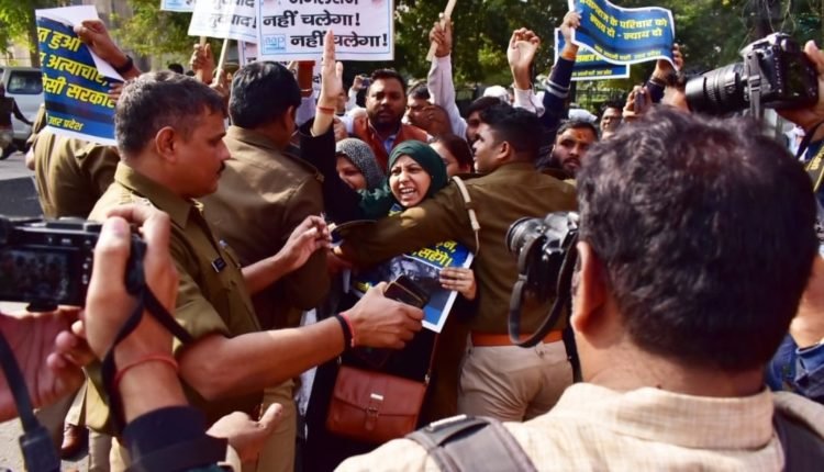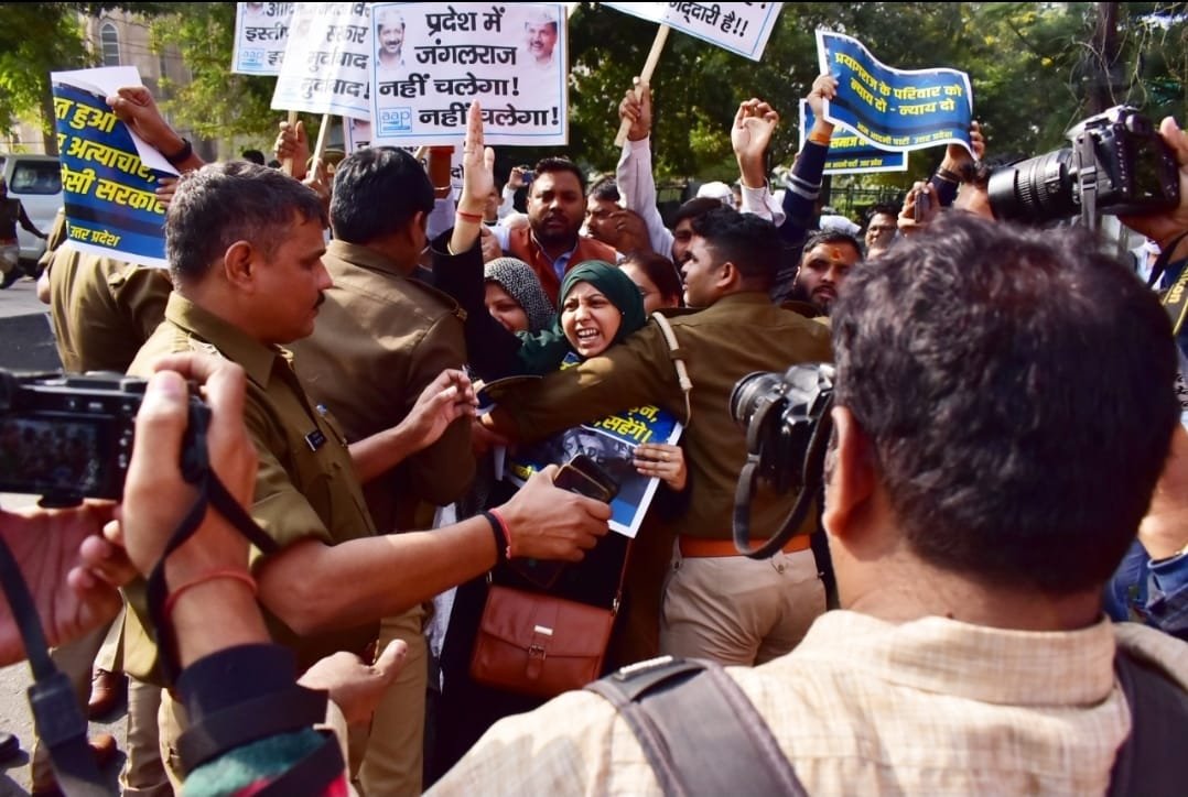 प्रयागराज में दलित किशोरी से गैंग रेप और परिवार सहित हत्या के विरोध में AAP ने किया विरोध प्रदर्शन