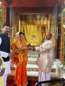 अयोध्या : मशहूर फिल्म अभिनेत्री कंगना रनौत अपनी नई फिल्म तेजस की सफलता के लिए भगवान राम का आशीर्वाद लेने गुरुवार को अयोध्या पहुंची। गुरुवार की दोपहर 12:00 बजे राम जन्मभूमि परिसर के वीआईपी गेट नंबर 11 से मंदिर के अंदर दाखिल हुई। जहां पर उन्होंने भगवान राम लला का दर्शन पूजन किया। मंदिर में राम लला का दर्शन पूजन करते समय अभिनेत्री कंगना रनौत को मंदिर के पुजारी ने रामनामा भेंट कर स्वागत अभिनन्दन किया