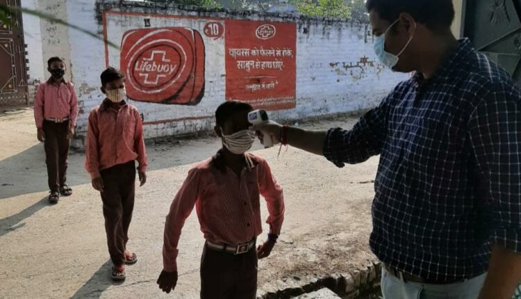कोविड-19 प्रोटोकॉल थर्मल स्कैनिंग व मॉस्क के साथ बच्चों को दी गई इन्ट्री।