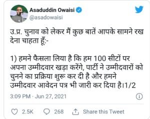 असदुद्दीन ओवैसी ने कहा कि ”यूपी चुनाव को लेकर मैं कुछ बातें आपके सामने रख देना चाहता हूं, हमने फैसला लिया है कि हम 100 सीटों पर अपना उम्मीदवार खड़ा करेंगे, पार्टी ने उम्मीदवारों को चुनने का प्रक्रिया शुरू कर दी है और हमने उम्मीदवार आवेदन पत्र भी जारी कर दिया है।