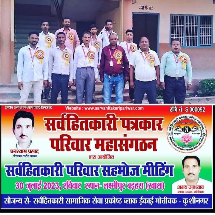 कुशीनगर: देश के सुप्रतिष्ठित राष्ट्रीय सामाजिक महासंगठन सर्वहितकारी पत्रकार परिवार महासंगठन का सर्वहितकारी परिवार सहभोज मीटिंग मे संस्थापक एवं राष्ट्रीय अध्यक्ष ने उपस्थित सदस्यों और पदाधिकारियों के साथ सहभोज कार्यक्रम सम्पन्न कराया।