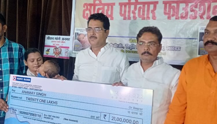 क्षत्रिय परिवार फाउंडेशन ने ₹21 लाख का चेक बतौर योगदान अनमय के माता-पिता को सौंपा