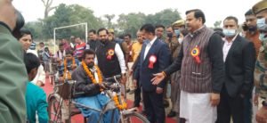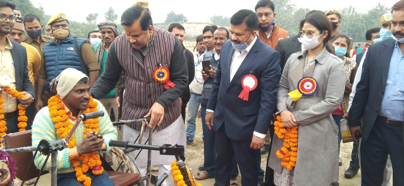 बहराइच : विश्व दिव्यांगता दिवस के अवसर इन्दिरा स्टेडियम में आयोजित कृत्रिम अंग सहायक उपकरण वितरण शिविर में मा. मंत्री, जल शक्ति (सिंचाई एवं जल संसाधन, बाढ़ नियंत्रण, लघु सिंचाई, नमामि गंगे तथा ग्रामीण जलापूर्ति विभाग) डॉ. महेन्द्र सिंह ने सांसद बहराइच अक्षयवर लाल गोंड, विधायक पयागपुर सुभाष त्रिपाठी, सदर विधायक श्रीमती अनुपमा जायसवाल, बलहा की श्रीमती सरोज सोनकर, जिलाधिकारी डॉ. दिनेश चन्द्र, पुलिस अधीक्षक सुजाता सिंह, मुख्य विकास अधिकारी कविता मीना के साथ 110 दिव्यांगजनों को ट्राईसाइकिल, 10-10 कान की मशीन व स्मार्ट ब्लाइण्ड स्टिक का वितरण किया। इसके अलावा शिविर में 25 दिव्यांगजनों का यू.डी.आई.डी. कार्ड हेतु रजिस्ट्रेशन भी किया गया।