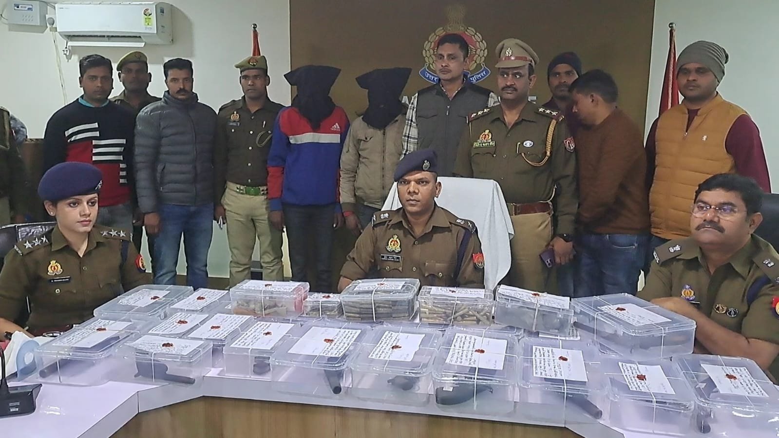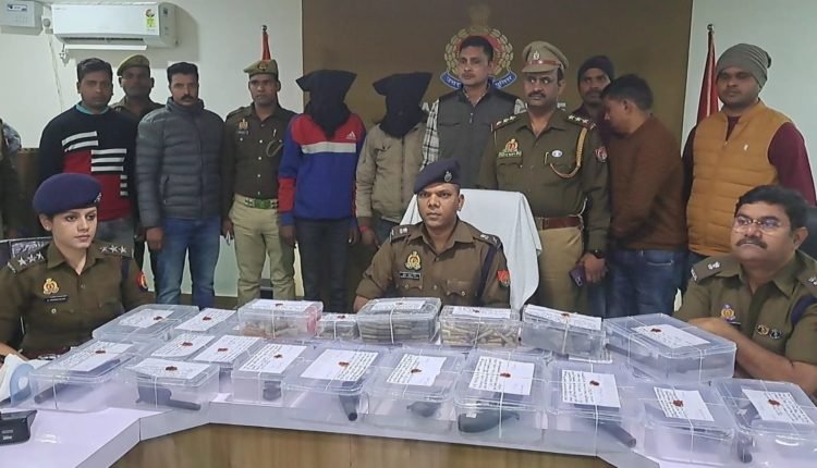 पुलिस अधीक्षक कुंवर अनुपम सिंह द्वारा अपराध और अपराधियों के विरुद्ध चलाए जा रहे अभियान के तहत प्रभारी निरीक्षक कोतवाली गुरसहायगंज जितेंद्र कुमार सिंह एसओजी प्रभारी उपनिरीक्षक देवेश कुमार के नेतृत्व में थाना गुरसहायगंज अंतर्गत कृपाशंकर देवेंद्र कुमार कोल्ड स्टोरेज तिर्वा रोड ऊंचा के अंदर कमरा लेकर चलाई जा रही अवैध असला फैक्ट्री का भंडाफोड़ करते हुए 315 बोर के 14 देसी तमंचे 12 बोर के 7 देसी तमंचों के जखीरे के साथ साथ 315 बोर के निर्मित अर्ध निर्मित 84 जिंदा कारतूस वह 315 बोर कारतूस के 334 खोखे 315 बोर के बुलेट 69 12 बोर कारतूस के तीन खोखे बा कारतूस बनाने के सामान में गंधक राख टिक्की सहित शस्त्र बनाने के उपकरणों के साथ शस्त्र बनाते हुए मुखबिर की सूचना पर पहुंची पुलिस ने खाड़े देवर गुरसहायगंज निवासी राजीव कुमार पुत्र सुरेश चंद्र कठेरिया के साथ पप्पू उर्फ तहसीन पुत्र मोहम्मद इदरीश निवासी डुडुआ बुजुर्ग गुरसहायगंज को गिरफ्तार किया जिसका खुलासा पुलिस अधीक्षक कुवंर अनुपम सिंह ने अपर पुलिस अधीक्षक डॉ अरविंद कुमार सीओ सिटी डॉ प्रियंका बाजपेई के साथ संयुक्त रूप से मीडिया के सामने किया । अवैध असला फैक्ट्री का भंडाफोड़ करते हुए 315 बोर के 14 देसी तमंचे 12 बोर के 7 देसी तमंचों के जखीरे के साथ साथ 315 बोर के निर्मित अर्ध निर्मित 84 जिंदा कारतूस वह 315 बोर कारतूस के 334 खोखे 315 बोर के बुलेट 69, 12 बोर कारतूस के तीन खोखे बा कारतूस बनाने के सामान में गंधक राख टिक्की सहित शस्त्र बनाने के उपकरणों के साथ शस्त्र बनाते हुए मुखबिर की सूचना पर पहुंची पुलिस ने खाड़े देवर गुरसहायगंज निवासी राजीव कुमार पुत्र सुरेश चंद्र कठेरिया के साथ पप्पू उर्फ तहसीन पुत्र मोहम्मद इदरीश निवासी डुडुआ बुजुर्ग गुरसहायगंज को गिरफ्तार किया जिसका खुलासा पुलिस अधीक्षक कुवंर अनुपम सिंह ने अपर पुलिस अधीक्षक डॉ अरविंद कुमार सीओ सिटी डॉ प्रियंका बाजपेई के साथ संयुक्त रूप से मीडिया के सामने किया ।