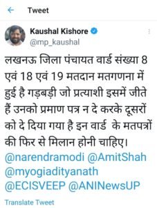 लखनऊ : जिला पंचायत चुनाव में धांधली का लगाया आरोप लखनऊ के वार्ड संख्या 8,18 व 19 में गड़बड़ी का आरोप बीजेपी सांसद का आरोप जीते हुए प्रत्याशियों को नहीं दिया गया प्रमाण पत्र जीते हुए प्रत्याशियों को न देकर दूसरे प्रत्याशियों को दिया गया प्रमाण पत्र बीजेपी सांसद ने मतपत्रों के मिलान की मांग की अपनी ही सरकार के अधिकारियों के खिलाफ सांसद का मोर्चा बीजेपी सांसद के ट्विट के बाद मचा हडकंप इससे पहले क्षेत्रीय सपा विधायक ने भी मोहनलालगंज मतगड़ना स्थल पर धांधली किए जाने की आशंका जताई थी और धरना प्रदर्शन करने की चेतावनी दी थी