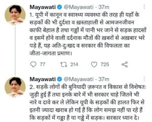 लखनऊ : बीएसपी सुप्रीमो मायावती का ट्वीट यूपी में सड़कों की भी दुर्दशा-माया कानून,स्वास्थ्य व्यवस्था की तरह ही सड़कें ख़स्ताहाल-मायावती सड़कों की दुर्दशा से आमजनजीवन बेहाल-मायावती सरकार की विफलता का जीता-जागता प्रमाण-मायावती सड़कें लोगों की बुनियादी ज़रूरत है- मायावत यूपी की सड़कों की हालत बेहद खराब-मायावती सड़कों में गड्ढा या गड्ढे में सड़क समझना मुश्किल-मायावती
