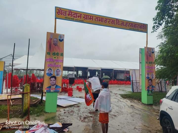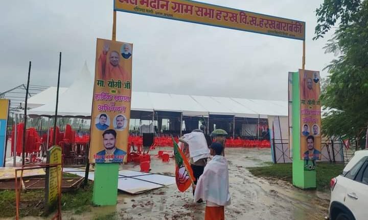 बाराबंकी : सूबे के मुख्यमंत्री योगी आदित्यनाथ का गुरुवार जनपद के जैदपुर व सदर विधानसभा में विभिन्न विकास योजनाओं का लोकार्पण, शिलान्यास, लाभार्थीपरक योजनाओं के प्रमाणपत्रों वितरण एवं जनसभा को सम्बोधित करना था। लेकिन बीती रात से लगातार हो रही भारी बारिश के चलते कार्यक्रम स्थल व हैलीपैड पर पानी भर जाने के चलते मुख्यमंत्री का कार्यक्रम निरस्त करना पड़ा। अपने एक दिवसीय भ्रमण कार्यक्रम के दौरान मुख्यमंत्री योगी आदित्यनाथ को आज सुबह 11ः30 बजे विधानसभा जैदपुर अंतर्गत जनपद इण्टर कालेज परिसर में व दोपहर 1ः30 बजे सदर विधानसभा अंतर्गत जीआईसी ऑडिटोरियम में 100 करोड़ लागत की विकास योजनाओं के लोकार्पण