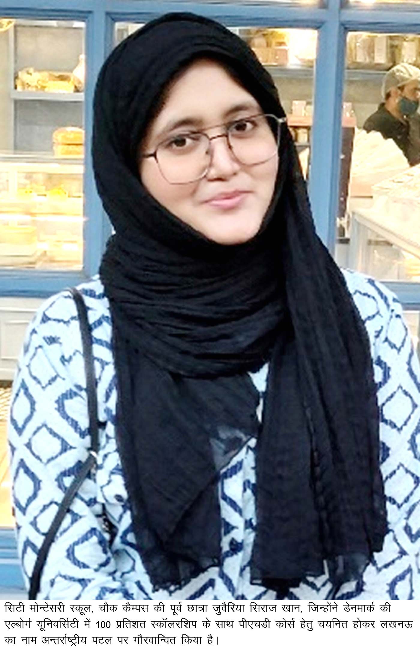 लखनऊ : सिटी मोन्टेसरी स्कूल, चैक कैम्पस की छात्रा जुवैरिया सिराज खान ने डेनमार्क की विश्व प्रसिद्ध एल्बोर्ग यूनिवर्सिटी में 100 प्रतिशत स्काॅलरशिप के साथ पीएचडी कोर्स हेतु चयनित होकर लखनऊ का नाम अन्तर्राष्ट्रीय पटल पर गौरवान्वित किया है। जुवैरिया सिराज खान, पूरे विश्व में एकमात्र प्रतिभागी रही हैं, जिन्होंने अत्यन्त कठिन चयन प्रक्रिया के उपरान्त इस प्रकार की उल्लेखनीय उपलब्धि अर्जित की है। इस चयन के उपरान्त सी.एम.एस. की यह मेधावी छात्रा डेनमार्क की एल्बोर्ग यूनिवर्सिटी से बाॅयोमेडिकल साइन्स एवं इंजीनियरिंग के क्षेत्र में शोध कार्य करेंगी, जिसके लिए इन्हें प्रतिवर्ष 45 लाख रूपये की आर्थिक मदद मिलेगी।