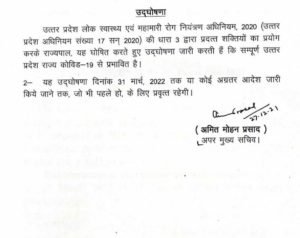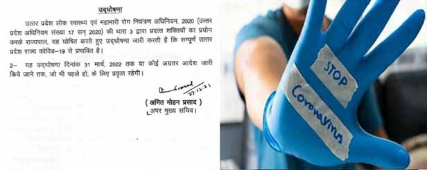 लखनऊ : कोरोना महामारी अधिनियम अब उत्तर प्रदेश में 31 मार्च 2022 तक लागू रहेगा। उत्तर प्रदेश लोक स्वास्थ्य एवं महामारी नियंत्रण अधिनियम 2020 की अवधि 31 दिसंबर 2021 को समाप्त हो रही थी। कोरोना के मामलों में बढ़ोत्तरी को देखते हुए इस अवधि को तीन महीने बढ़ाने का फैसला किया गया है। ऐसे में लोगों को कोविड प्रोटोकाल का सख्ती से पालन करने के निर्देश दिए गए है इसके आदेश अपर मुख्य सचिव, चिकित्सा एवं स्वास्थ्य अमित मोहन प्रसाद की ओर से जारी कर दिए गए हैं। राज्य सरकार की ओर से यह भी घोषित किया गया है कि पूरा प्रदेश कोविड-19 से प्रभावित है। प्रदेश में अब कोरोना संक्रमित मरीजों की संख्या में लगातार बढ़ोतरी हो रही है