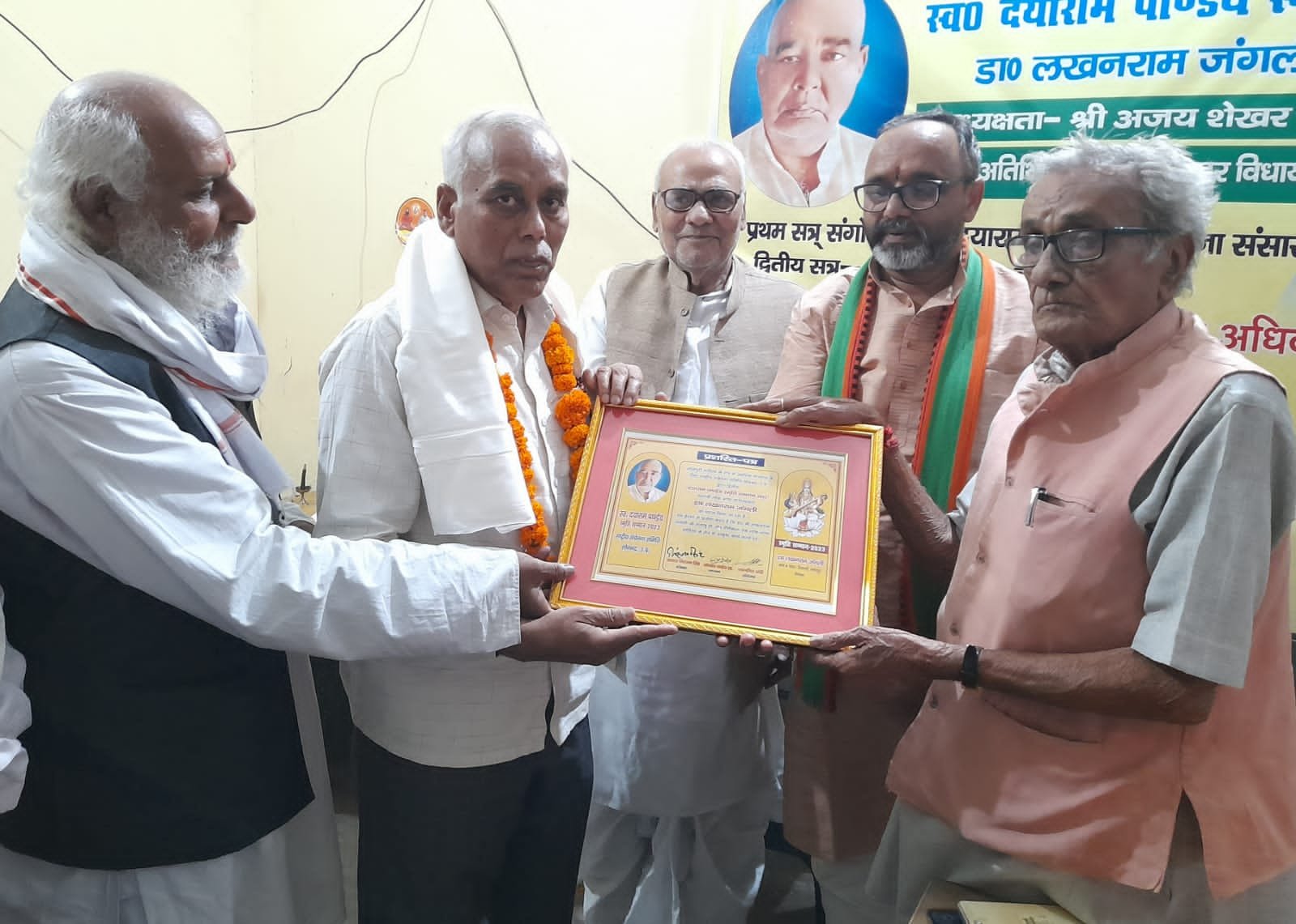 सोनभद्र: राष्ट्रीय संचेतना समिति सोनभद्र के तत्वावधान में साहित्यकार स्व० दयाराम पांडेय स्मृति सम्मान लीलासी म्योरपुर के लोक कवि डॉ० लखनराम जंगली को सोनभद्र बार एसोसिएशन सभागार में साहित्यकारों के बीच प्रदान किया गया जिसमें धनराशि प्रतीक चिन्ह प्रशस्ति पत्र अंगवस्त्र व साहित्यिक पुस्तकें प्रदान की गईं।