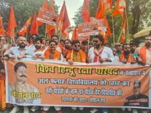 राष्ट्रीय अध्यक्ष गोपाल राय के नेतृत्व में प्रदर्शन कर रहे नाराज लोगों ने अल- फलाह यूनिवर्सिटी पर बुलोडजर चलाकर ध्वस्त करने की मांग की।