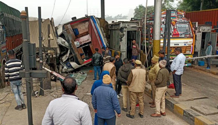 टोल प्लाजा पर पलटी डबल डेकर बस 14 यात्री घायल