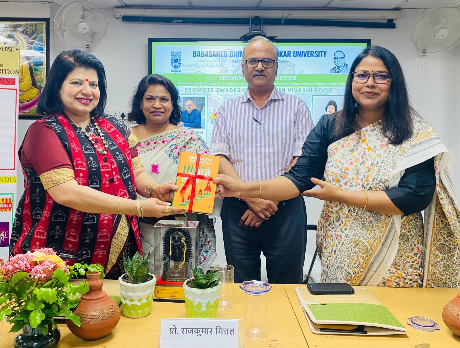 लखनऊ: बाबासाहेब भीमराव अम्बेडकर विश्वविद्यालय (बीबीएयू) में दिनांक 1 सितंबर को एमीनेंट लेक्चर व्याख्यानमाला के अंतर्गत कमेटी ऑफ एमीनेंट लेक्चर सीरीज और खाद्य एवं पोषण विभाग के संयुक्त तत्वावधान में ‘विदेशी भोजन की अपेक्षा स्वदेशी भोजन को बढ़ावा (Promote Swadeshi Food Over Videshi Food)’ विषय पर विशेष व्याख्यान आयोजित किया गया। कार्यक्रम की अध्यक्षता विश्वविद्यालय के कुलपति प्रो. राज कुमार मित्तल ने की। मुख्य अतिथि के रूप में मोहनलाल सुखाड़िया विश्वविद्यालय, उदयपुर, राजस्थान की कुलपति प्रो. सुनीता मिश्रा उपस्थित रहीं।कार्यक्रम की शुरुआत दीप प्रज्वलन और बाबासाहेब के छायाचित्र पर पुष्पांजलि अर्पित करने के साथ हुई। विश्वविद्यालय कुलगीत गायन के पश्चात आयोजन समिति की ओर से मुख्य अतिथि और मंचासीन शिक्षकों का पौंधा भेंट कर स्वागत किया गया। कार्यक्रम का संचालन डॉ. शिखा तिवारी ने किया।कुलपति प्रो. राज कुमार मित्तल ने अपने संबोधन में कहा कि संतुलित और पौष्टिक आहार केवल शरीर ही नहीं बल्कि विचारों और मन को भी सकारात्मक बनाए रखता है। उन्होंने छात्रों और युवाओं को यह संदेश दिया कि हमें ‘स्थानीय उपयोगी, स्वदेशी जरूरी और विदेशी मजबूरी’ की विचारधारा अपनानी चाहिए। उन्होंने भारतीय संस्कृति और परंपरा से जुड़ी स्थानीय खानपान परंपराओं को प्राथमिकता देने की आवश्यकता पर जोर दिया। प्रो. मित्तल ने कहा कि स्वदेशी भोजन अपनाने से स्वास्थ्य की रक्षा के साथ-साथ स्थानीय अर्थव्यवस्था को भी सशक्त बनाया जा सकता है, और यह आत्मनिर्भर भारत के निर्माण में भी सहायक है।मुख्य अतिथि प्रो. सुनीता मिश्रा ने भारत में विदेशी खाद्य आउटलेट्स की बढ़ती संख्या और इसके युवाओं पर प्रभाव का उल्लेख किया। उन्होंने कहा कि वर्ष 2010 में देश में 1,200 विदेशी आउटलेट्स थे, जो 2024 में लगभग 7,500 तक पहुँच चुके हैं। शहरी क्षेत्रों में घर का बना भोजन पिछले एक दशक में 28% घट गया है। उन्होंने यह भी बताया कि विदेशी फूड ब्रांड्स युवाओं को आकर्षित करने के लिए बड़े पैमाने पर विज्ञापन करते हैं, जिससे जंक फूड और अस्वास्थ्यकर भोजन की ओर प्रवृत्ति बढ़ती है। प्रो. मिश्रा ने बताया कि भारतीय भोजन संतुलित, पौष्टिक और स्वास्थ्यवर्धक होता है, जिसमें प्रोटीन, विटामिन, फाइबर और मिनरल्स की पर्याप्त मात्रा होती है। दाल, चावल, रोटी, सब्ज़ियाँ, दही और मसालों का संतुलित संयोजन भारतीय भोजन को सम्पूर्ण बनाता है।कार्यक्रम के दौरान आयोजन समिति की ओर से खाद्य एवं पोषण से संबंधित प्रदर्शनी का भी आयोजन किया गया, जिसका उद्देश्य स्थानीय खाद्य उत्पादकों और स्वदेशी सामग्री के उपयोग को बढ़ावा देना था। अंत में मुख्य अतिथि को स्मृति चिन्ह भेंट कर आभार व्यक्त किया गया, और प्रो. नीतू सि