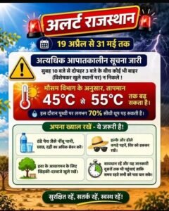 आगामी दिनों में तापमान 47°C से 55°C तक बढ़ सकता है। कुछ क्षेत्रों में गर्म हवाएं (लू) चल सकती हैं, जिससे सांस लेने में दिक्कत हो सकती है। कृपया निम्नलिखित सावधानियों का पालन करें: