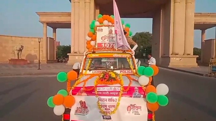 उपस्थित महिला सशक्तिकरण पंचम चरण में महिला पिंक स्कूटी को पुलिस कमिश्नर लखनऊ और जिलाधिकारी लखनऊ ने 1090 चौराहे से हरी झंडी दिखा कर रवाना किया महिला सशक्तिकरण के पंचम चरण का कल से लगभग एक महीने तक चलने वाले इस कार्यक्रम में महिलाओं और बालिकाओं को किया जायेगा जागरूक।