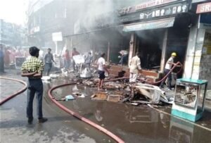 गुलजार ट्रेडर्स की दुकान के बेसमेंट में लगी आग।