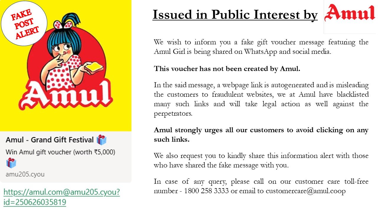अमूल ने सोशल मीडिया प्लेटफॉर्म X (पहले ट्विटर) पर एक सार्वजनिक चेतावनी जारी करते हुए लिखा, हम आपको सूचित करना चाहते हैं कि व्हाट्सएप और सोशल मीडिया पर अमूल गर्ल की फोटो वाला एक फर्जी गिफ्ट वाउचर शेयर किया जा रहा है. यह वाउचर अमूल द्वारा जारी नहीं किया गया है.