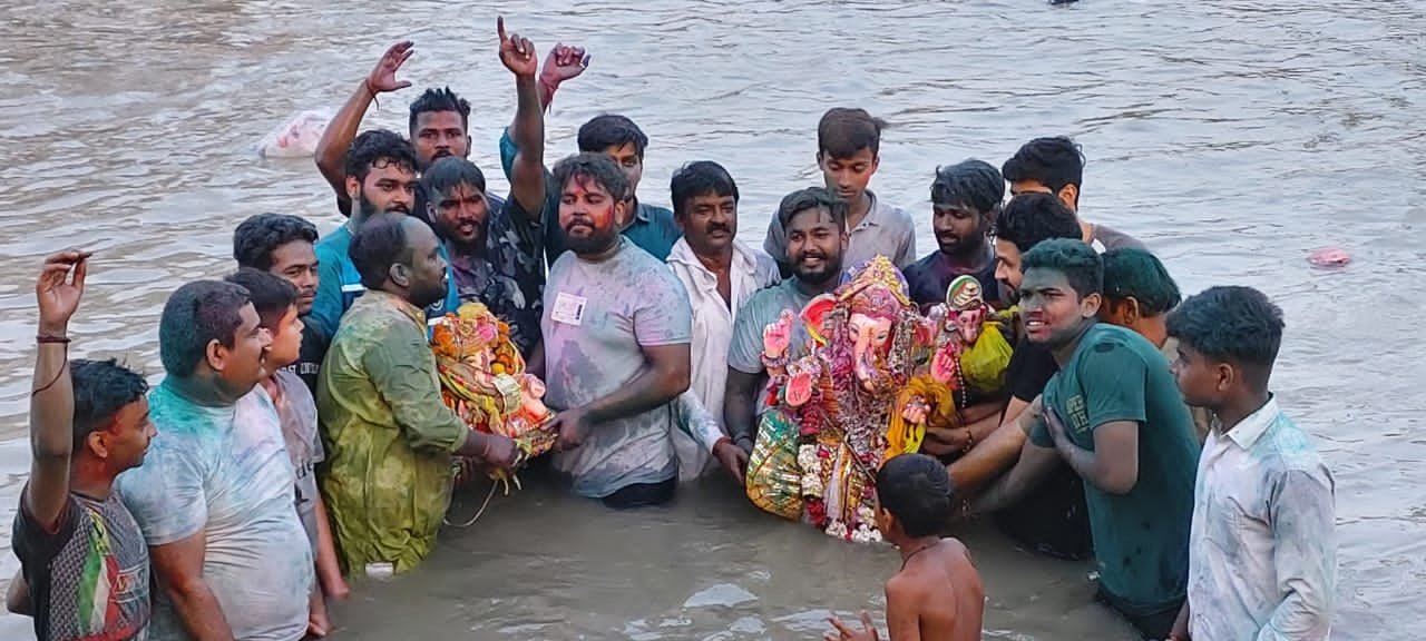 पत्रकार विशाल कश्यप ने परिवार के साथ मानकमऊ घाट पर मूर्ति को विसर्जित किया