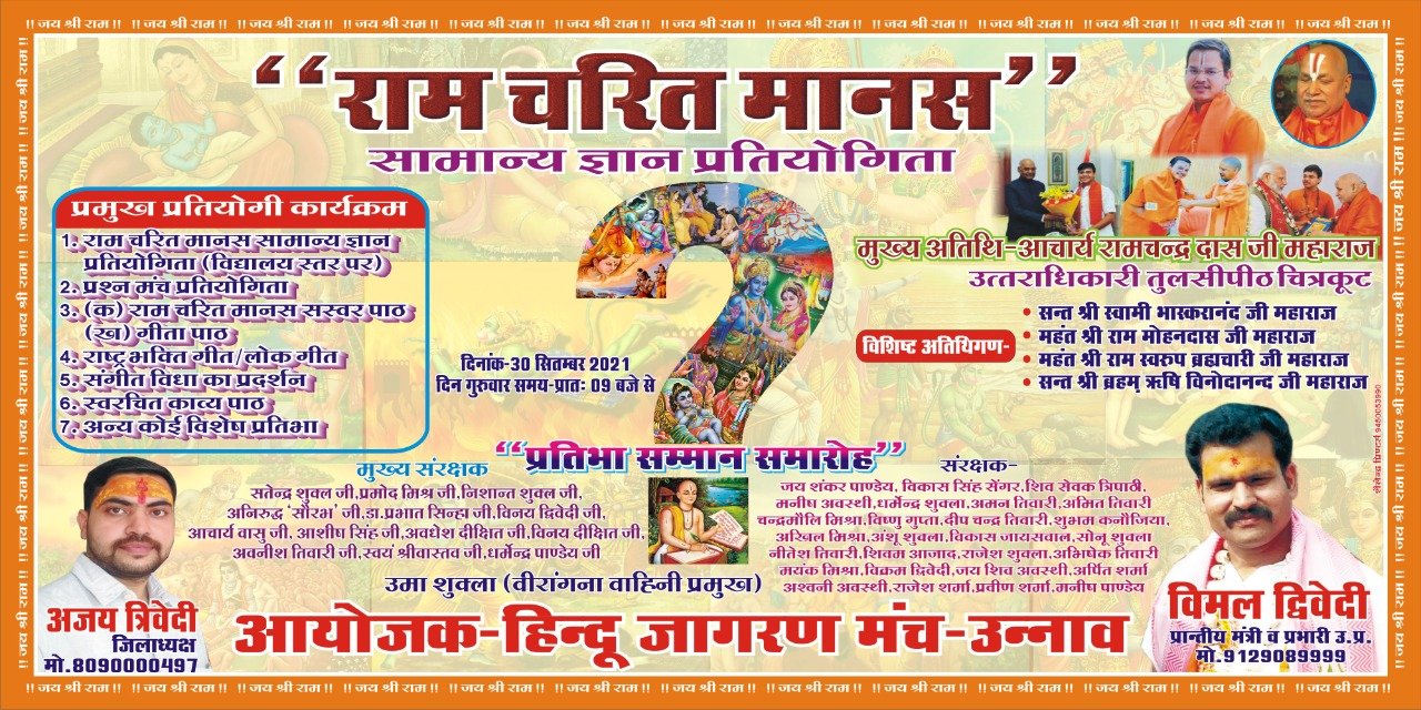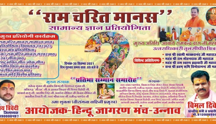 उन्नाव : हिन्दू जागरण मंच के प्रांतीय मंत्री एवं प्रभारी विमल द्विवेदी ने प्रेस वार्ता आयोजित कर 30 सितंबर को मानस जागरण मंच  के बैनर तले होने वाले कार्यक्रम की रूपरेखा के बारे में जानकारी दी।उन्होंने बताया कि रामचरितमानस सामान्य ज्ञान प्रतियोगिता विद्यालय स्तर पर आयोजित कराई गई थी जिसके प्रश्न-पत्र मंच द्वारा निःशुल्क उपलब्ध कराये गए थे, जिसमें नगर के 50 से अधिक विद्यालयों द्वारा 3 मेधावी छात्र/छात्राओं को प्रश्न मंच हेतु 30 सितम्बर के कार्यक्रम में भेजा जाएगा साथ ही समस्त विद्यालयों द्वारा रामचरित मानस सस्वर पाठ, गीता पाठ, लोक गीत/राष्ट्रभक्ति गीत,संगीत विद्या की प्रस्तुति ,अन्य कोई प्रतिभा विशेष आदि वर्गों में अपनी भागीदारी करेंगे। जिसमें सभी मेधावी विद्यार्थियों व सभी विद्यालयों को मंच द्वारा सम्मानित किया जाएगा।