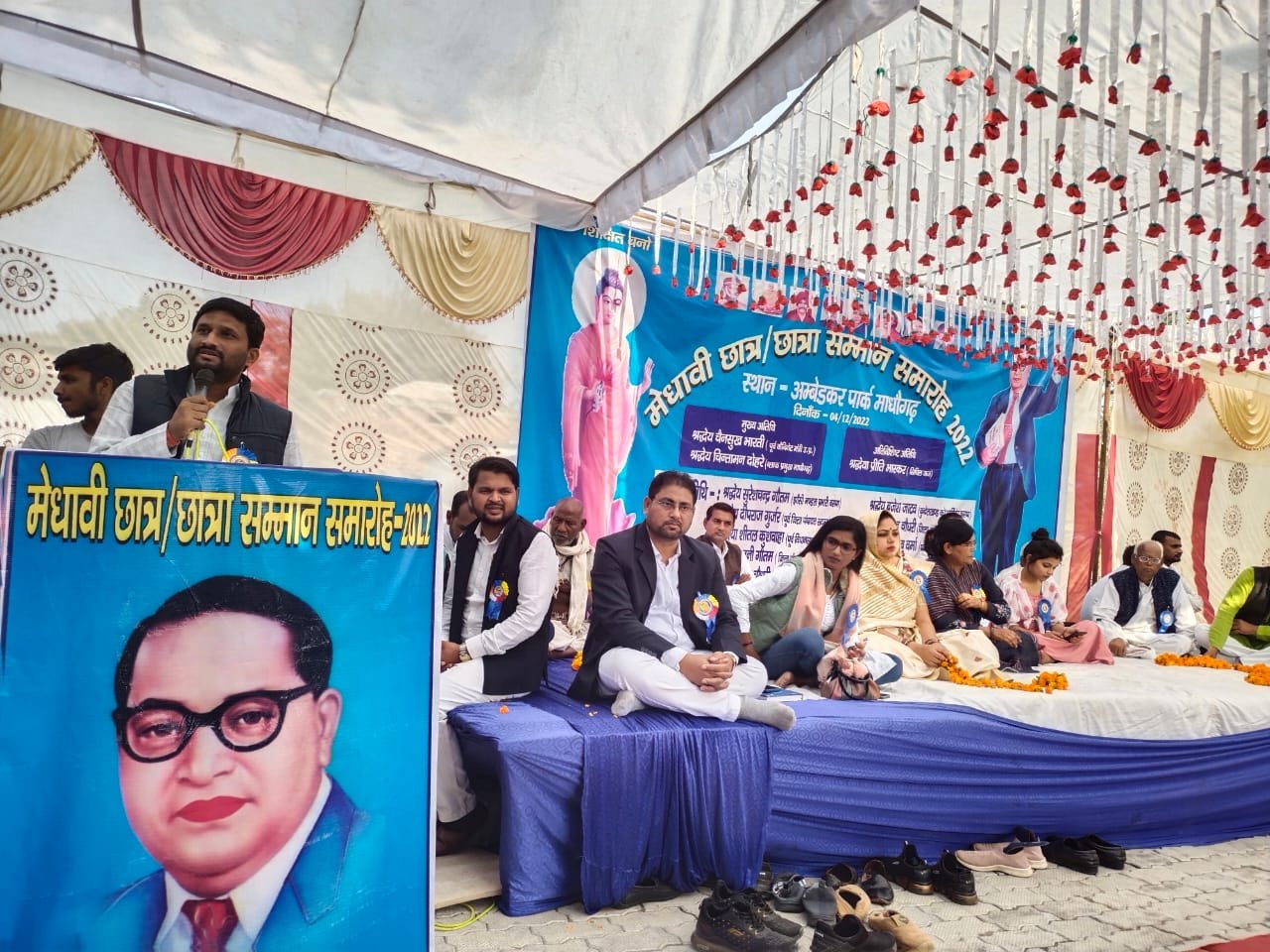 माधौगढ़ (जालौन) मेघावी छात्र छात्राओं का सम्मान समारोह डॉ भीमराव अंबेडकर माधौगढ नगर विकास समिति के द्वारा बाबा साहब भीमराम अम्बेडकर पार्क में हुआ जिसमें मुख्य अतिथि के रूप में पधारे पूर्व कैविनेट मंत्री उत्तर प्रदेश चेनसुख भारती, ब्लॉक प्रमुख चिंतामन दोहरे माधौगढ, प्रीति भास्कर सिविल जज झांसी,शीतल कुशवाहा पूर्व विधानसभा प्रत्यशी 219 माधौगढ, दीपराज गुर्जर पूर्व जिलापंचायत सदस्य,रजनी गौतम जिलापंचायत सदस्य बघेरा झांसी ने पहुच कर कार्यक्रम में छात्र छात्राओं का मनुबल बढ़ाया कहा कि हम सबको मिलकर अपने अपने बच्चों को शिक्षा की तरफ ले जाना है न कि नशे की तरफ हर बर्ष की तरह इस बर्ष भी मेघावी छात्र छात्राओं को सम्मानित करने का जो सील सिला चल रहा है वह बहुत ही सराहनीय है ऐसा ही हमेसा चलता रहे शिक्षा वह शेरनी का दुग्ध है जो पियेगा वह धहाड़ेगा तो वही रजनी गौतम ने कहा कि में झांसी से चलकर इस प्रगाढ़ में आई हूं इस लिए की बाबा साहव भीमराव अंबेडकर कर ने जो हमे दिया है वह शायद किसी को दिया हो नारी को चलने का अधिकार नही था आज पड़ लिखकर आगे बढ़ाने का कार्य कर रही है जिस संविधान से देश चल रहा है वह बाबा साहब भीमराव अंबेडकर ने लिखा है नारी को हक़ दिलाने का काम किया है शायद किसी ने उन से ज्यादा कुर्वानी दी हो करवा बढ़ाने के लिए उन्होंने अपने घर बच्चों व पत्नी को भी छोड़ दिया था उनकी राह पर चलना हम सबके लिए बड़ी गौरव की बात है वही शीतल कुशवाहा ने कहा कि SC बर्ग जिस तरफ जा रहा है जिनको बचने के लिए आये दिन ऐसी कार्यक्रम करना अवयस्क है क्योंकि ऐसे कार्यो से SC, OBC के लोगो को बढ़ाने का काम किया जायेगा,प्राचीन काल मे महिलाओं की बो स्तिथि थी जिसे देखकर हम सबके रोंगटे खड़े हो जायेगे,जिसकी दसा बदलने वाले एक ही मसीहा थे जो बाबा साहब डॉ भीमराव अंबेडकर थे जिन्होंने हम सबको अधिकार दिलाये।इस इस मौके पर ब्लॉक प्रमुख चिंतामन दोहरे, चैनसुख भारती, सी पी वर्मा, दीपराज गुर्जर, शीतल कुशवाहा, श्याम बाबू वर्मा मानसिंह, मनीष चौधरी, जंग बहादुर नेता भगवानपुरा, इस्पेंद्र कुमार, किरण दोहरे सहित भारी संख्या में ग्रामीण उपस्थित रहे