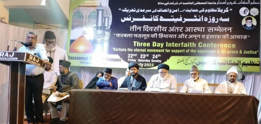 लखनऊ : करबला मज़लूम की हिमायत, शांति और न्याय की आवाज़ के विषय से संस्था तनज़ीमुल मकातिब द्वारा जमीअतुल मुस्तफा की भागीदारी के साथ तीन दिवसीय इंटरफेथ सम्मेलन का पहला जलसा मौलाना सय्यद सफी हैदर ज़ैदी सचिव संस्था तनज़ीमुल मकातिब की अध्यक्षता में गोलागंज स्थित संस्था तनज़ीमुल मकातिब परिसर में आयोजित हुआ।