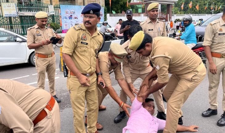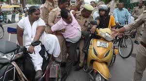 लखनऊ में दिव्यांगों को पुलिस ने घसीटा।