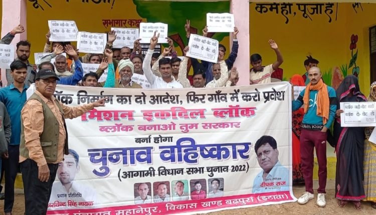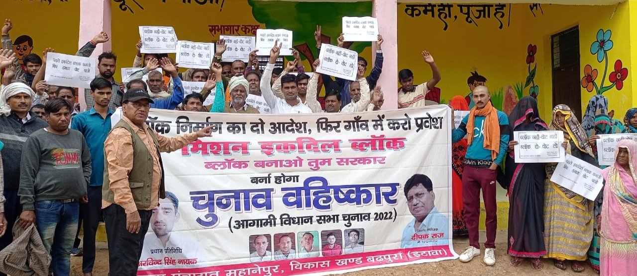 इटावा : बहुत किया इंतजार अबकी बार आर पार का संकल्प लेकर मिशन इकदिल ब्लॉक द्वारा चलाए जा रहे सत्याग्रह कार्यक्रम के साथ साथ आठवीं ग्राम पंचायत का चुनाव बहिष्कार का कार्यक्रम शुक्रबार को बढ़पुरा विकासखंड की ग्राम पंचायत महानेपुर में किया गया। यह ग्राम पंचायत बढ़पुरा विकासखंड की आखरी सीमा पर स्थित है अर्थात बढ़पुरा विकासखंड के मुख्यालय की दूरी यहां से सबसे अधिक पड़ती है यहीं से भरथना विकासखंड की सीमा शुरू होती है । लोगों को संबोधित करते हुए मिशन संयोजक दीपक राज ने विकास खंड के मुख्यालय से दूरी का पूर्णतया एहसास कराया और कहा कि आप लोग इस दूरी से निजात पाना चाहते हैं तो इस चुनाव बहिष्कार का बहुत ही आत्मीयता के साथ पालन करना पड़ेगा। आप लोगों को इस बात का संकल्प दृढ़ता के साथ लेना पड़ेगा की हमारे वोट की कीमत अब सिर्फ हमारा विकास खंड ही है इसके अतिरिक्त हम और किसी शर्त पर अपना वोट यहां के आगामी विधानसभा चुनाव में किसी को भी नहीं देंगे अर्थात पहले नए विकासखंड की घोषणा की जाए उसके उपरांत यहां की पार्टियां हम लोगों से चुनाव में वोट की अपील करें।