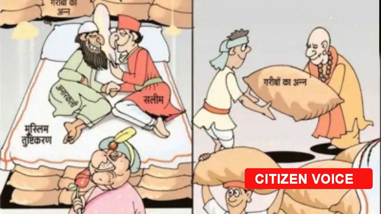 कार्टून में, ओवैसी और अखिलेश यादव को मुगल सम्राट जहांगीर और अनारकली के रूप में दिखाया गया है, जो गरीबों के लिए राशन की एक बोरी पर लेटे हुए दिखाई देते हैं, जबकि ‘अब्बा जान’ मुलायम सिंह यादव दिखते हैं। कार्टून के दूसरे हिस्से में मुख्यमंत्री योगी आदित्यनाथ गरीबों को राशन बांटते नजर आ रहे हैं
