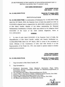 कर कर केरल की वायनाड लोक सभा सीट से राहुल गांधी की संसद सदस्यता फिर से बहाल कर दी है।आपको बता दें कि गुजरात के सूरत की एक अदालत द्वारा राहुल गांधी को दो साल की सजा दिए जाने के बाद, लोक सभा सचिवालय ने 24 मार्च 2023 को एक नोटिफिकेशन जारी कर 23 मार्च 2023 से उनकी लोक सभा की सदस्यता को रद्द कर दिया गया था राहुल गांधी 2019 के लोक सभा चुनाव में केरल के वायनाड से सांसद चुने गए थे।
