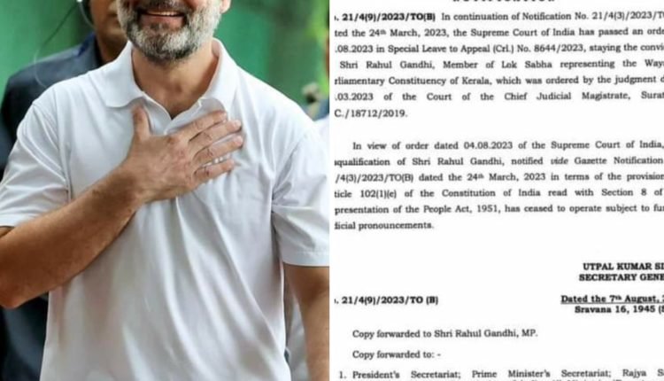 नई दिल्ली : सुप्रीम कोर्ट द्वारा सजा पर रोक लगाए जाने के बाद कांग्रेस नेता राहुल गांधी की संसद सदस्यता फिर से बहाल हो गई है लोक सभा सचिवालय ने 4 अगस्त 2023 को सुप्रीम कोर्ट द्वारा दिए गए फैसले का हवाला देते हुए सोमवार को एक अधिसूचना जारी