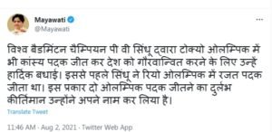 लखनऊ : बीएसपी सुप्रीमो मायावती ने ट्वीट किया पीवी सिंधु को ट्वीट कर माया ने बधाई दी रियो ओलंपिक में भी सिंधु ने पदक जीता था पीवी सिंधु को बहुत-बहुत बधाई- मायावती।
