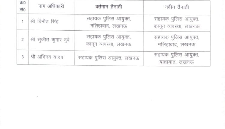 Lucknow Police News:विनीत सिंह को सहायक पुलिस आयुक्त कानून व्यवस्था लखनऊ बने।सुजीत कुमार दुबे को सहायक पुलिस आयुक्त मलिहाबाद बनाया गया।अभिनव यादव को सहायक पुलिस आयुक्त लखनऊ से हटाकर सहायक पुलिस आयुक्त यातायात लखनऊ बनाया गया है।