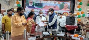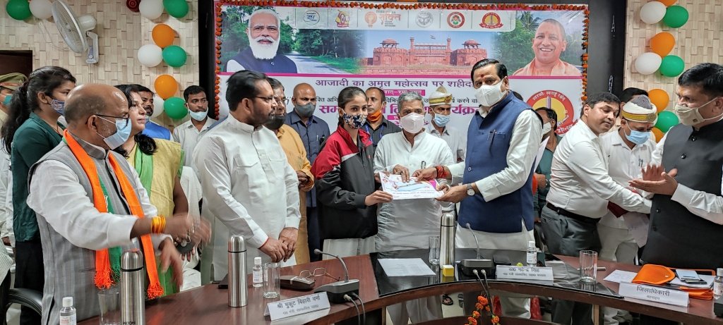 बहराइच : नारी सशक्त प्रदेश के उद्देश्य से नारी सुरक्षा, नारी सम्मान व नारी स्वावलम्बन हेतु मिशन शक्ति के तृतीय चरण के शुभारम्भ अवसर पर विकास भवन सभागार में आयोजित मेगा कार्यक्रम में मा. मंत्री, जल शक्ति विभाग (सिंचाई एवं जल संसाधन, बाढ़ नियंत्रण, लघु सिंचाई, नमामि गंगे तथा ग्रामीण जलापूर्ति) डा. महेन्द्र सिंह व प्रदेश के सहकारिता मंत्री मुकुट बिहारी वर्मा ने सांसद बहराइच अक्षयवर लाल गोंड, विधायक पयागपुर सुभाष त्रिपाठी, महसी के सुरेश्वर सिंह, बलहा की सरोज सोनकर, जिलाधिकारी डा  दिनेश चन्द्र, पुलिस अधीक्षक सुजाता सिंह व अन्य के साथ मिशन शक्ति के प्रथम एवं द्वितीय चरण के दौरान उत्कृष्ट कार्य करने वाली जनप्रतिनिधियों, अधिकारियों, कर्मचारियों, खिलाड़ियों, स्वयं सहायता समूह की महिलाओं व अन्य को प्रशस्ति-पत्र, राखी व मास्क प्रदान कर सम्मानित किया गया।