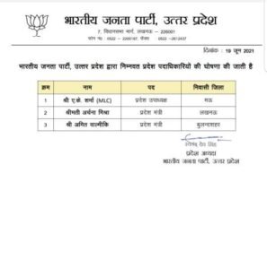 भाजपा मुख्यालय से जारी बयान के अनुसार प्रदेश अध्यक्ष ने पीएम मोदी के करीबी पूर्व आईएएस एके शर्मा को सबसे बड़ी जिम्मेदारी दी है। उन्हें प्रदेश उपाध्यक्ष बनाया है। इसके अलावा अर्चना मिश्रा (लखनऊ) और अमित वाल्मीकि (बुलन्दशहर) को प्रदेश मंत्री नियुक्त किया है।