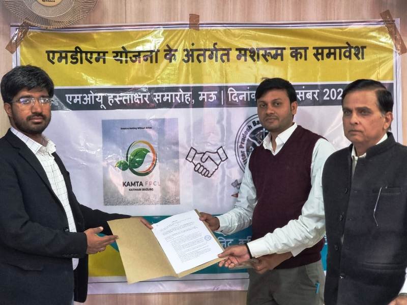 मऊ। जनपद मऊ में प्राथमिक एवं उच्च प्राथमिक विध्यालयों में मध्यान भोजन योजना अंतर्गत मशरूम आपूर्ति हेतु जिले के कामता फार्मर प्रोडूसर कंपनी लिमिटेड (एफपीसी) एवं जिला शिक्षा विभाग के मध्य एमओयू हस्ताक्षरित किया गया। इसके तहत टेक्निकल सपोर्ट यूनिट, कृषि विभाग, उत्तर प्रदेश के समर्थन द्वारा बेसिक शिक्षा विभाग एवं कामता फार्मर प्रोडूसर कंपनी लिमिटेड एफपीसी के बीच एमओयू हस्ताक्षरित किया गया। इसके अंतर्गत बेसिक शिक्षा विभाग के प्राइमरी एवं अपर प्राइमरी विद्यालय के बच्चों को मीड-डे-मील योजना में पोषण दृष्टी से सप्ताह में एक दिन मशरूम उपलब्ध कराया जायेगा। मशरूम में पोष्टिक तत्वों की प्रचूरता होती है, अतः इसके मध्यान भोजन में सम्मिलित होने से बच्चों को पोष्टिक आहार भी मिलेगा वही किसानों की आय दोगुनी होगी। जिले में किसानों द्वारा उत्पादित मशरूम की आपूर्ति एफपीसी द्वारा विद्यालयों को की जाएगी। इस पहल के माध्यम से एफपीसी के सदस्य किसानो की आजीविका संवर्धन हेतु अभिनव पहल मुख्य विकास अधिकारी प्रशांत नागर के दिशानिर्देश में की गयी। मुख्य विकास अधिकारी ने इस योजना को पारदर्शी तरीके से संचालित करने का निर्देश दिया। प्रथम चरण में योजना की शुरुआत पायलट प्रोजेक्ट के रूप में जिले के बडराव ब्लाक से की जाएगी तथा बडराव ब्लाक को ‘मशरूम ब्लॉक’ के रूप में विकसित किये जाने की योजना है। ब्लाक में योजना के सफल संचालन के उपरांत जिले के अन्य विकास खण्डों में भी मशरूम आपूर्ति पर विचार किया जायेगा। अतः किसानों को रोजगार का अवसर प्रदान करते हुए पुरे जिले के 1465 विद्यालयों के लगभग दो लाख से अधिक बच्चों को लाभान्वित किया जा सकता। इस मौके पर जिला बेसिक शिक्षा अधिकारी, डा० संतोष कुमार सिंह ने कहा कि इस पहल से विद्यालय में बच्चों के अतिरिक्त लाभ मिलने की उम्मीद की जाती है तथा इसके सकारात्मक परिणाम के उपरांत इसके उदाहरण के रूप में प्रस्तुत किया जायेगा। इस मौके पर जिला उप कृषि निर्देशक एसपी श्रीवास्तव ने कहा कि इस पहल से किसानो के आये को बढाया जा सकता है क्यों की इसके तहत किसानो को एक सुनिषित मार्केट उपलब्ध कराया जायेगा जिससे किसानो के लिए पारम्परिक खेती के अलावा भी आय के अन्य स्त्रोतों का सृजन संभव हो सकेगा। इस अवसर पर जिला बेसिक शिक्षा अधिकारी डा० संतोष कुमार सिंह, पीयूष पाण्डेय, उप कृषि निदेशक एसपी श्रीवास्तव, मानवेन्द्र प्रताप शाही सीईओ, कामता फार्मर प्रोडूसर कंपनी लिमिटेड एवं टेक्निकल सपोर्ट टीम, कृषि विभाग सहित अन्य सम्बंधित जन उपस्थित थे।
