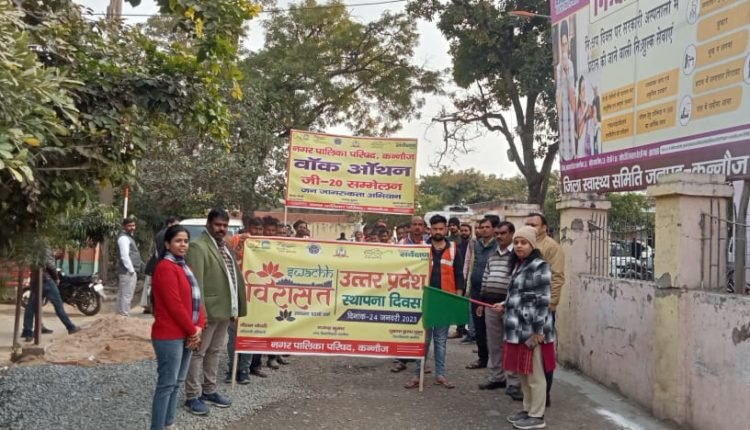 कन्नौज ।उत्तर प्रदेश स्थापना दिवस के अंतर्गत स्वच्छ भारत मिशन को लेकर नगर पालिका परिषद कन्नौज द्वारा सफाई कर्मचारियों के साथ वॉक ऑथन का आयोजन किया गया जिसे सामुदायिक स्वास्थ्य केंद्र विनोद दीक्षित से अधिशासी अधिकारी द्वारा हरी झंडी दिखाकर रवाना किया गया ।