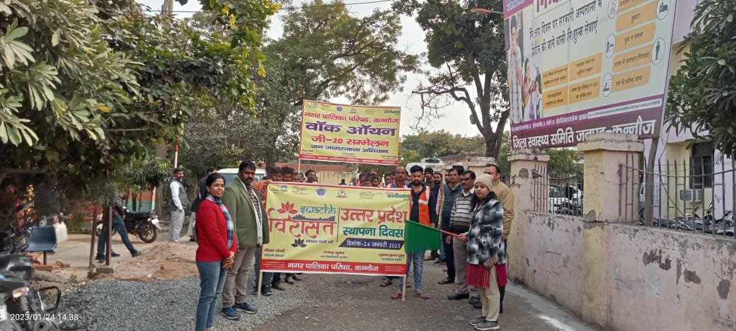 शासन के निर्देशानुसार उत्तर प्रदेश स्थापना दिवस 24 जनवरी से 26 जनवरी 2023 के अंतर्गत स्वच्छ भारत मिशन में नगर पालिका परिषद कन्नौज में सफाई कर्मचारियों के साथ वॉक ऑथन का आयोजन किया गया जिसे नगरपालिका अधिशासी अधिकारी नीलम चौधरी ने सामुदायिक स्वास्थ्य केंद्र विनोद दीक्षित से हरी झंडी दिखाकर रवाना किया अस्पताल प्रांगण से चलकर नगरपालिका कर्मचारी रैली के रूप में लाखन तिराहा होते हुए नगर पालिका परिषद कन्नौज के प्रांगण में पहुंचकर इस भ्रमण कार्यक्रम को विराम दिया गया इस रैली का मुख्य नगर वासियों को जी-20 सम्मेलन प्लास्टिक के विरुद्ध शहर में साफ सफाई के प्रति एक स्वच्छ सर्वेक्षण 2023 के प्रति जागरूक करना था साथ ही नगर पालिका परिषद के अंतर्गत निवास करने वाले नगर वासियों से नगर को स्वच्छ रखने में पालिका का सहयोग करना था इस अवसर पर डीपीएम हर्षिता गोयल सफाई एवं खाद्य निरीक्षक अमित कुमार अवर अभियंता राजकुमार लेखाकार राजीव विक्रम जिला समन्वयक आतिफ हुसैन सिद्दीकी समस्त सफाई नायक एवं पालिका के कर्मचारी उपस्थित रहे ।