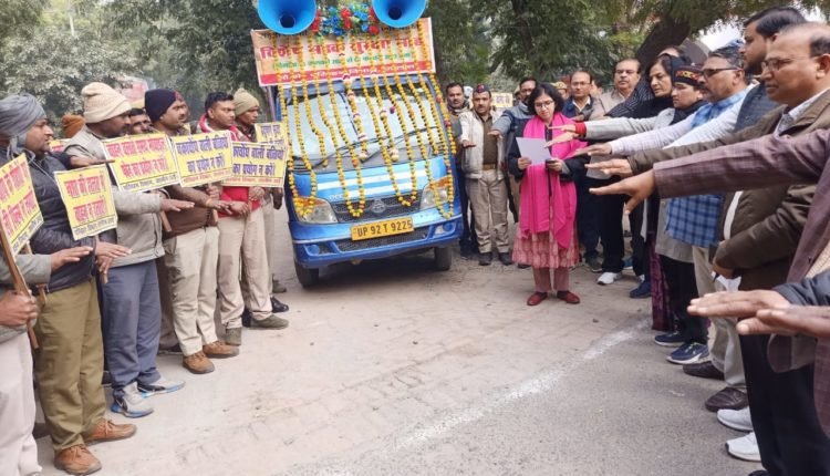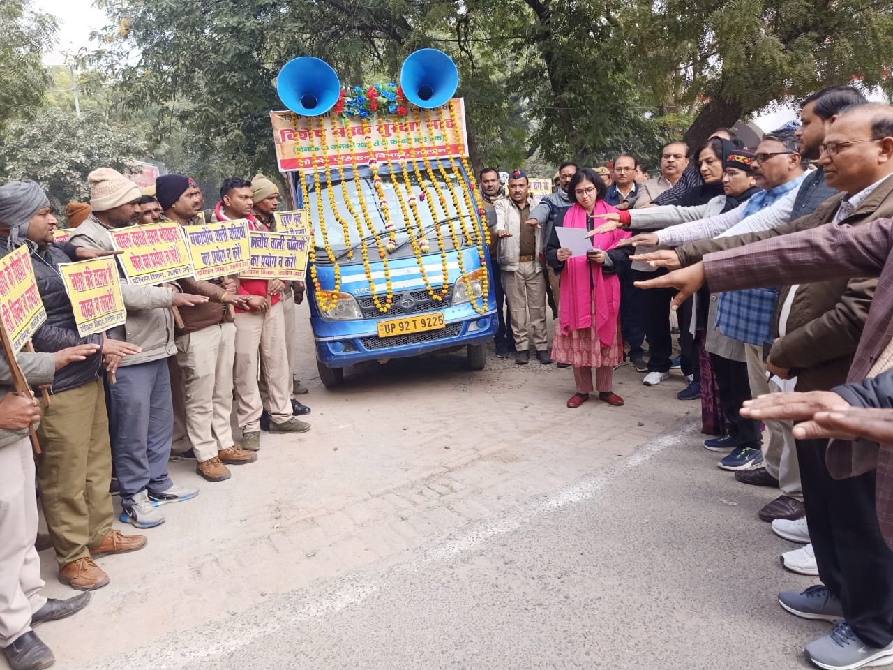 उरई(आरएनएस)। यातायात नियमों के संबंध में लोगों को जागरूक करने हेतु दिनांक 05 जनवरी 2023 से 04 फरवरी 2023 तक चलाए जा रहे अभियान सड़क सुरक्षा माह को सफल बनाने के उद्देश्य कलेक्ट्रेट परिसर से जिलाधिकारी चाँदनी सिंह ने जागरूकता वाहन रैली को हरी झंडी दिखाकर रवाना किया। कार्यक्रम में उपस्थित अधिकारियों व जनप्रतिनिधियों को सड़क सुरक्षा नियमों के पालन हेतु शपथ भी दिलाई गई। उन्होंने जनपद वासियों को यातायात नियमों का पालन करने का आह्वान करते हुए कहा कि मोटरसाइकिल चलाते समय हेलमेट और कार में सीट बेल्ट का प्रयोग अनिवार्य रूप से करें। उन्होंने यातायात से संबंधित जागरूकता पंपलेट वितरित करने के भी निर्देश दिए। उन्होंने कहा कि सड़क पर वाहन चालकों को हमेशा सड़क सुरक्षा नियमों का पालन करना चाहिए वाहन चलाते समय हेलमेट अवश्य पहनना चाहिए तथा मोबाइल फोन का इस्तेमाल नहीं करना चाहिए वही चार पहिया वाहन चलाते समय सीट बेल्ट का प्रयोग अवश्य करें। इस अवसर पर अतिरिक्त मजिस्ट्रेट सौरभ कुमार पांडे, एआरटीओ प्रशासन सौरव कुमार, एआरटीओ प्रथम उमेश कुमार, एआरटीओ द्वितीय प्रवर्तन विनय कुमार पांडे, जिला विद्यालय निरीक्षक राजकुमार पंडित, बेसिक शिक्षा अधिकारी सचिन कुमार, अधिशासी अभियंता लोक निर्माण विभाग, सहायक क्षेत्रीय प्रबंधक रोडवेज आदि सहित संबंधित मौजूद रहे।
