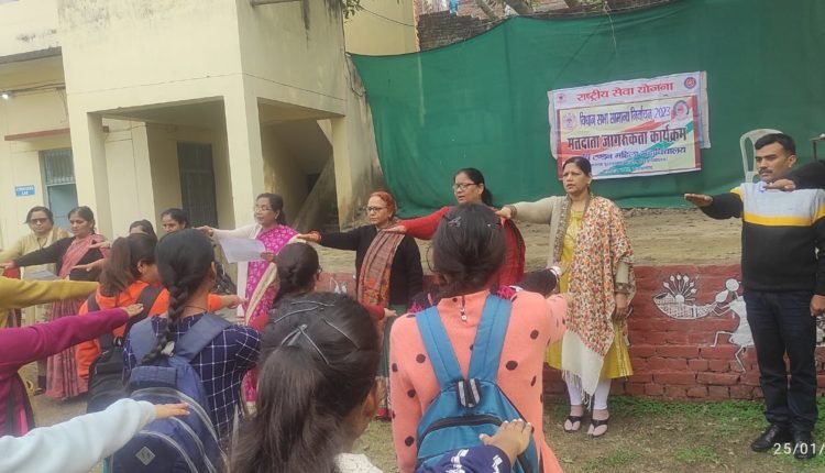 प्रयागराज। राजर्षि टंडन महिला महाविद्यालय, (संघटक, इलाहाबाद विश्वविद्यालय प्रयागराज) की राष्ट्रीय सेवा योजना की इकाई के तत्त्वावधान में आज “राष्ट्रीय मतदाता जागरुकता दिवस” का आयोजन किया गया। महाविद्यालय की प्राचार्या प्रो. रंजना त्रिपाठी ने मतदान का महत्त्व बताते हुए कहा कि देश के प्रत्येक नागरिक को मतदान करना आवश्यक है। चूंकि एक-एक वोट अत्यन्त कीमती होता है इसीलिए मतदान अवश्य करना चाहिए। उन्होंने शिक्षकों, स्वयं सेविकाओं के साथ ही विधानसभा 2023 के चुनाव हेतु निर्वाचन आयोग से आयी टीम के सदस्यों को भी मतदाता जागरूकता हेतु शपथ दिलवायी।