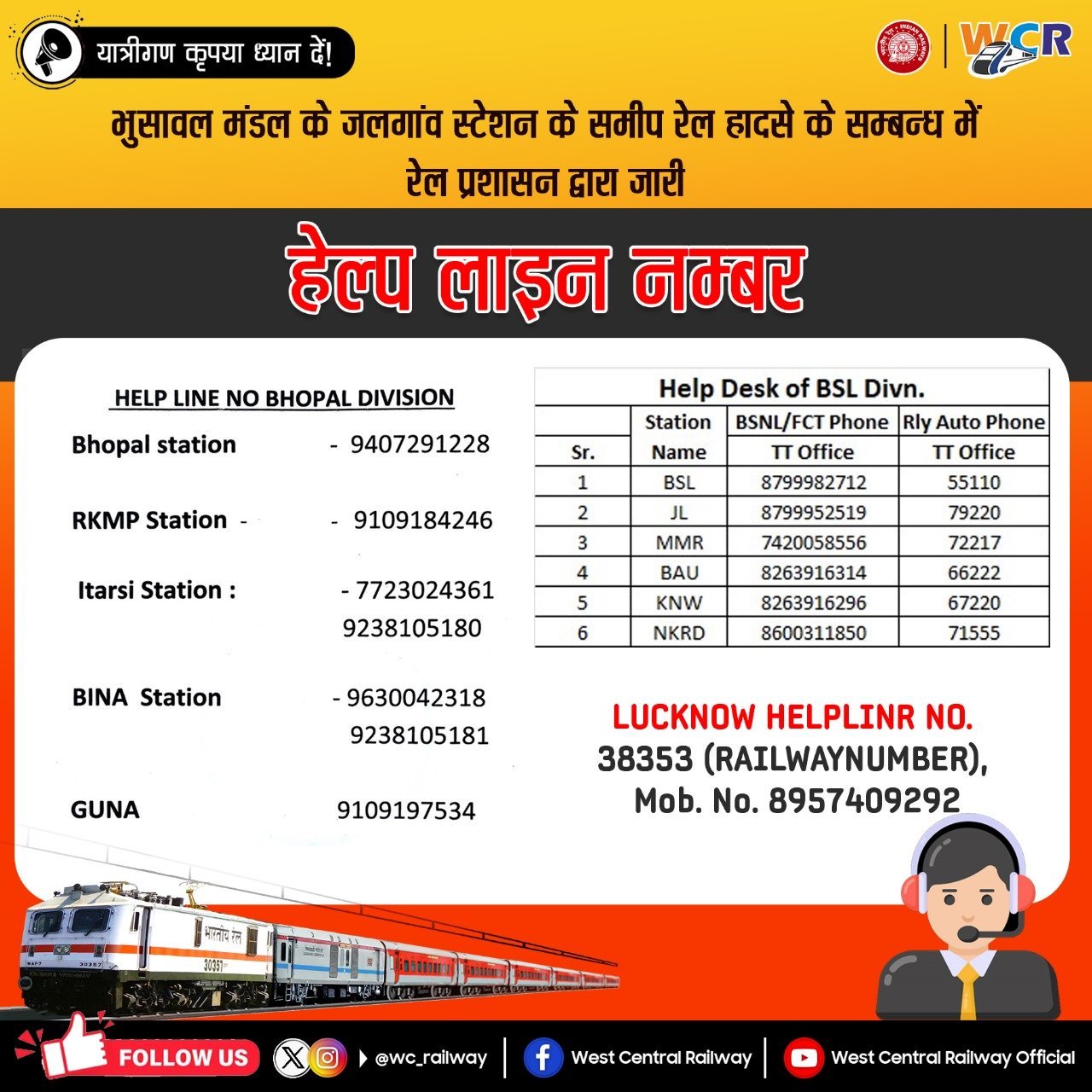 पुष्पक ट्रेन हादसा।लखनऊ रेलवे ने जारी किए हेल्पलाइन नंबर 8957409292
