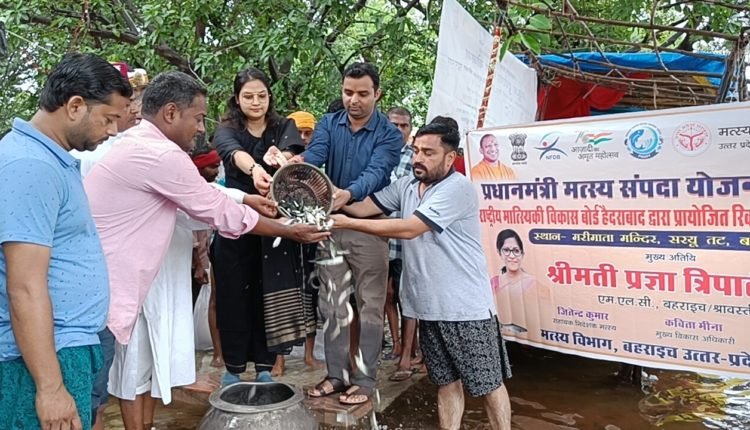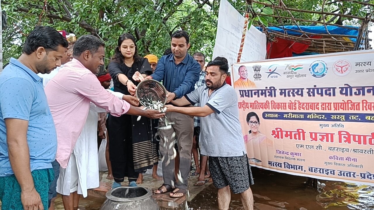 बहराइच। मत्स्य विभाग की ओर से सरयू नदी के किनारे स्थित श्री मरी माता मन्दिर के तट पर प्रधानमंत्री मत्स्य सम्पदा योजनान्तर्गत राष्ट्रीय मात्स्यिकी विकास बोर्ड द्वारा प्रायोजित रिवर रैंचिंग कार्यक्रम का आयोजन किया गया। रैंचिंग कार्यक्रम के दौरान मुख्य अतिथि एमएलसी डॉ. प्रज्ञा त्रिपाठी व मुख्य विकास अधिकारी कविता द्वारा 3.05 लाख मत्स्य अंगुलिका बीज का संचय किया गया। इस अवसर पर निषाद पार्टी के जिलाध्यक्ष अमरनाथ निषाद, कार्यकारिणी सदस्य शिव गोविंद निषाद, सहायक निदेशक मत्स्य डॉ. जितेन्द्र कुमार, ज्येष्ठ मत्स्य निरीक्षक नारद लाल राणा सहित अन्य सम्बन्धित मौजूद रहे।