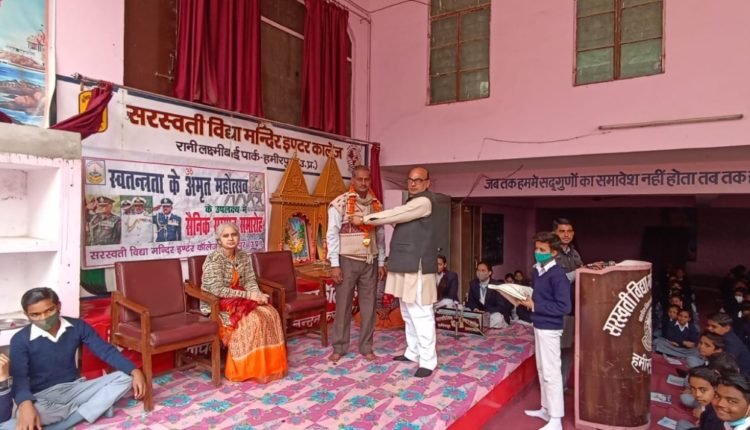 ‌हमीरपुर : स्थानीय सरस्वती विद्या मंदिर इण्टर कालेज हमीरपुर मे स्वतंत्रता के अमृत महोत्सव के उपलक्ष्य मे सैनिक सम्मान समारोह मनाया गया। सैनिक सम्मान समरोह के अतिथि के रुप मे आशुतोष द्विवेदी पूर्व सैनिक व वृक्षमित्र कमलेश सिंह उपाख्य विट्टो दीदी धर्मपत्नी स्व0 रामपाल सिंह भदौरिया पूर्व सैनिक रहे। कमलेश सिंह का सम्मान जीव विज्ञान प्रवक्ता अनीता सिंह ने अंगवस्त्र व माला पहनाकर इन्हे सम्मानित किया। अतिथि परिचय विद्यालय के प्रधानाचार्य रामप्रकाश गुप्ता ने कराया तथा आशुतोष द्विवेदी को अंगवस्त्र व माला पहनाकर सम्मानित किया।