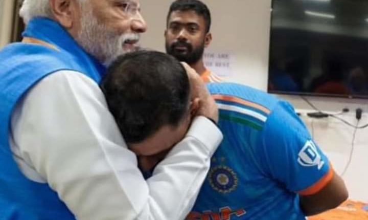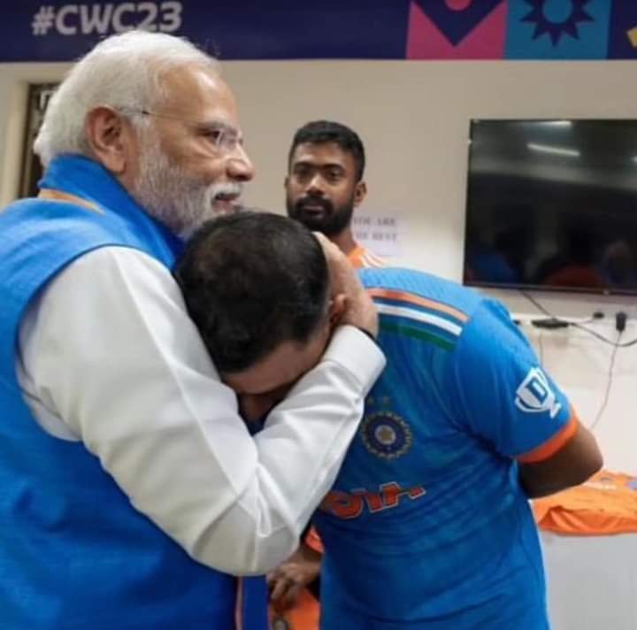 ये तस्वीर ना सिर्फ यादगार है बल्कि शानदार है मोदी जी ने गले से लगा कर जो हौसला दिया है वो शमी के स्टेटस मे झलकता है मोहम्मद शमी तुम महान हो हम सब को आप पर गर्व है।