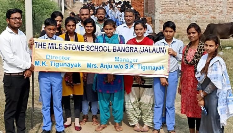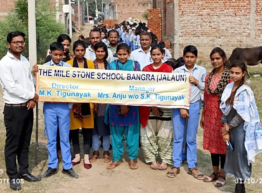 जालौन:आज द माइल स्टोन स्कूल बंगरा के प्रबंधक प्रधानाचार्य छात्र एवं छात्राओं ने मिलकर लौह पुरुष सरदार वल्लभ भाई पटेल जी की जयंती को राष्ट्रीय एकता दिवस के रूप में मनाया गया जिसके अन्तर्गत मानव एकता शृंखला का आयोजन किया गया सरदार पटेल के जीवन चरित की वृहद जानकारी दी गई रैली को हरी झंडी प्रबंधक श्रवण कुमार तिगुनायक जी ने दिखाई छात्र छात्राओं के मध्य एकता दौड़ भी कराई गई तत्पश्चात छात्र छात्राओं की रैली निकाली गई