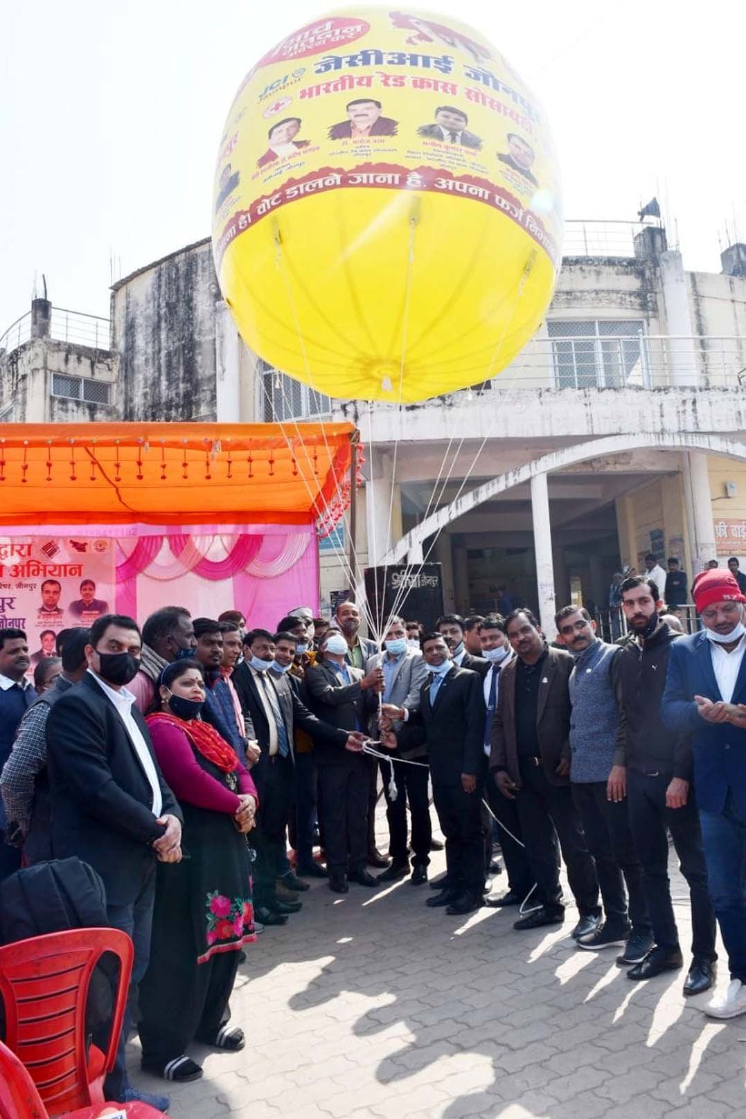 जौनपुर : जेसीआई के अध्यक्ष डा. संदीप पाण्डेय के नेतृत्व में तथा रेडक्रास सोसाइटी के सचिव डा. मनोज वत्स के संयुक्त प्रयास से रोडवेज परिसर में लोगों को मतदान के प्रति जागरूक करने के उद्देश्य से एक स्काई बैलून लगाया गया। संस्था द्वारा किये गये इस कार्यक्रम का शुभारम्भ जिलाधिकारी/जिला निर्वाचन अधिकारी मनीष वर्मा के हाथों किया गया। मुख्य अतिथि जिलाधिकारी ने बताया कि प्रजातंत्र में हर व्यक्ति को एक ही मत देने का अधिकार प्राप्त है, इसलिये सबको अपने अधिकार का प्रयोग अवश्य करना चाहिये।