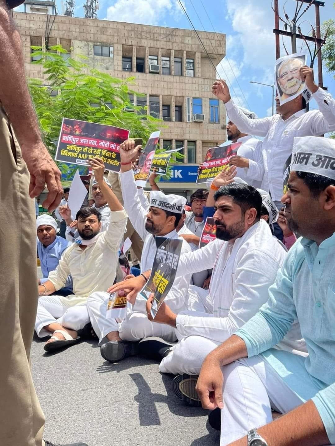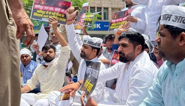 मणिपुर घटना को लेकर नोएडा सेक्टर 18 में प्रदेश अध्यक्ष पंकज अवाना वा यूथ जिलाअध्यक्ष विक्रांत लोहिया ने आप कार्यकर्ताओं के साथ धरना प्रदर्शन कर विरोध जताया